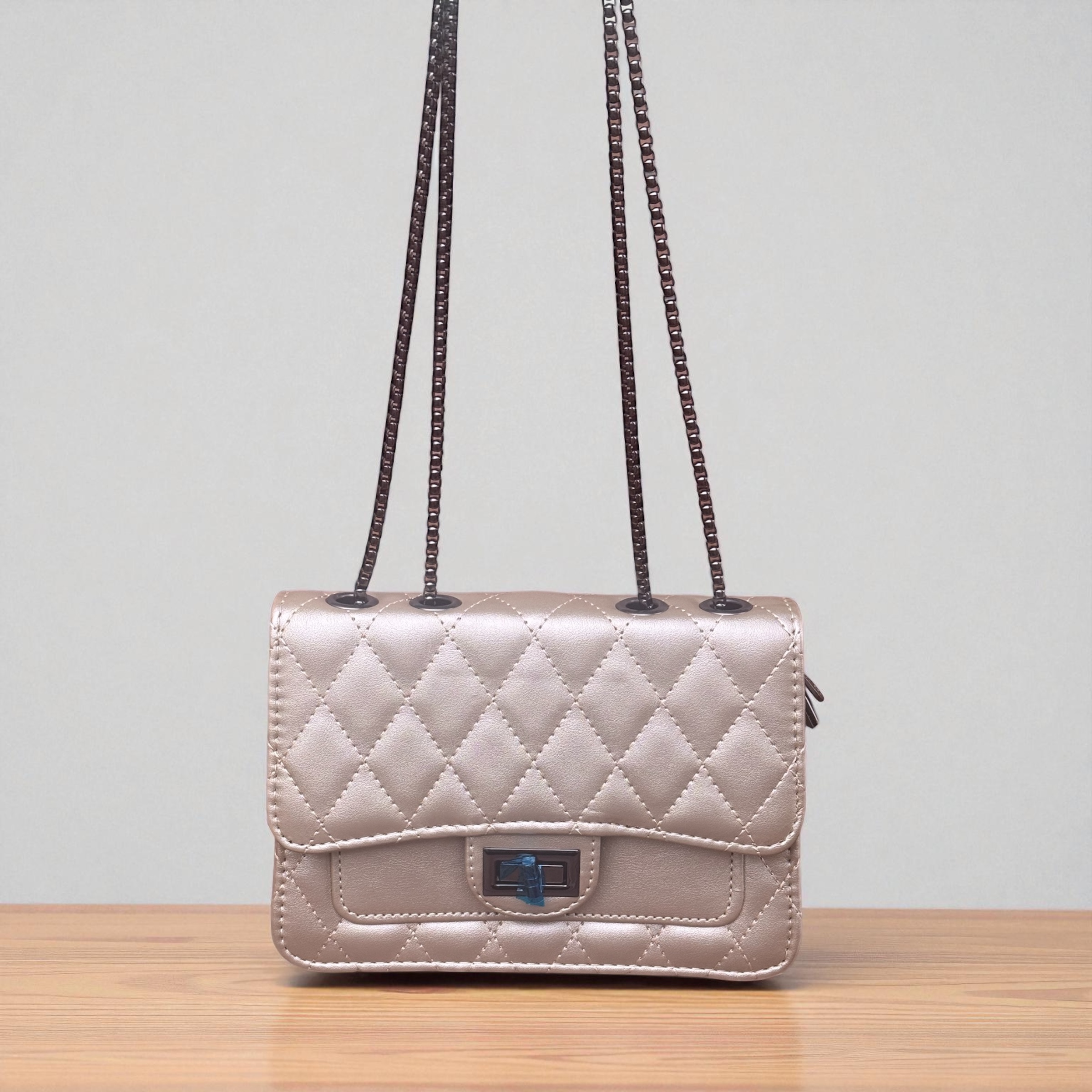 A Bolsa Valentina Champagne é puro requinte em forma de acessório. Com seu tom neutro e sofisticado, ela combina perfeitamente com produções elegantes ou casuais. O design matelassê em losangos traz um ar clássico e atemporal, enquanto a alça em corrente metálica escura adiciona um toque moderno. O fecho frontal em metal completa o visual com delicadeza e estilo. Ideal para quem busca charme e versatilidade em uma única peça.